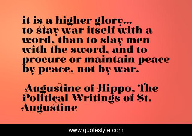 This page presents the quote "it is a higher glory... to stay war itself with a word, than to slay men with the sword, and to procure or maintain peace by peace, not by war.". Author of this quote is Augustine of Hippo, The Political Writings of St. Augustine. This quote is about peace, war,.