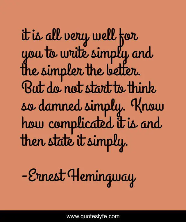 This page presents the quote "it is all very well for you to write simply and the simpler the better. But do not start to think so damned simply. Know how complicated it is and then state it simply.". Author of this quote is Ernest Hemingway. This quote is about philosophy, writing,.