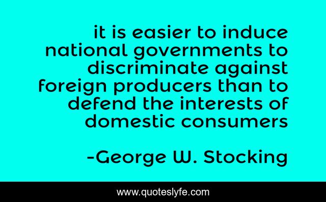 This page presents the quote "it is easier to induce national governments to discriminate against foreign producers than to defend the interests of domestic consumers". Author of this quote is George W. Stocking. This quote is about tariffs, economics,.