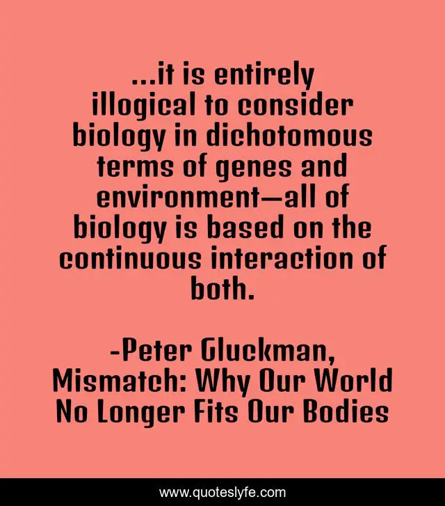 This page presents the quote "...it is entirely illogical to consider biology in dichotomous terms of genes and environment—all of biology is based on the continuous interaction of both.". Author of this quote is Peter Gluckman, Mismatch: Why Our World No Longer Fits Our Bodies. This quote is about biology, genetics,.