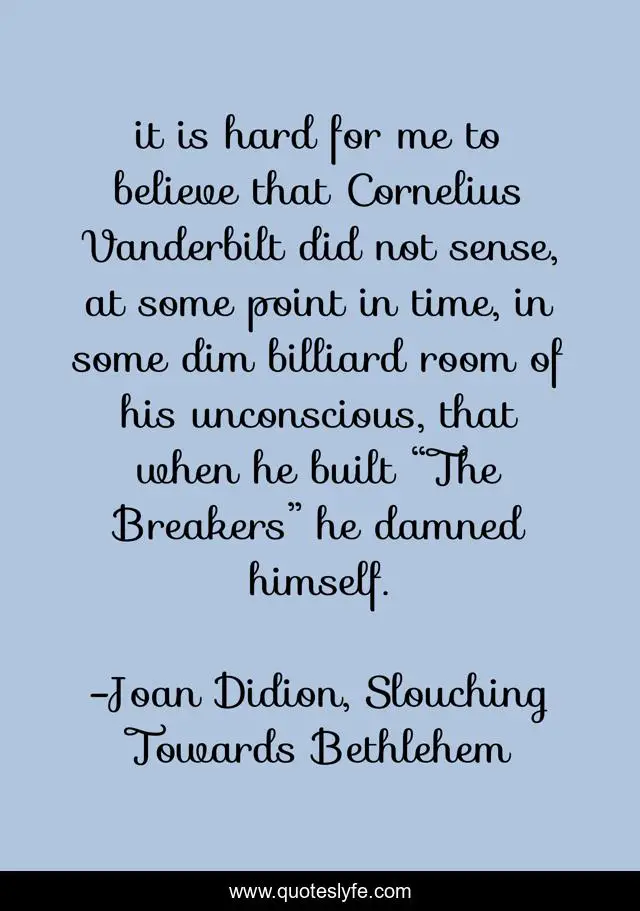 This page presents the quote "it is hard for me to believe that Cornelius Vanderbilt did not sense, at some point in time, in some dim billiard room of his unconscious, that when he built “The Breakers” he damned himself.". Author of this quote is Joan Didion, Slouching Towards Bethlehem. This quote is about california, wealth,.