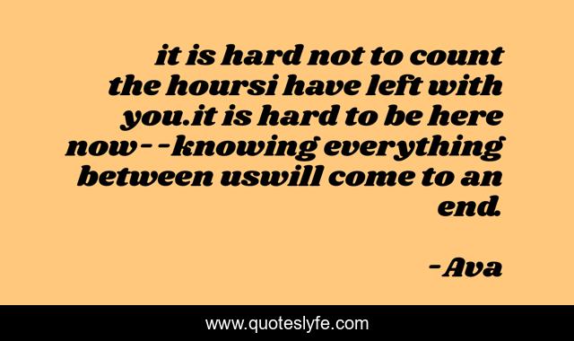 This page presents the quote "it is hard not to count the hoursi have left with you.it is hard to be here now--knowing everything between uswill come to an end.". Author of this quote is Ava. This quote is about love, human-nature, poetry, quotes, human, prose, poems, humanity, affection,.