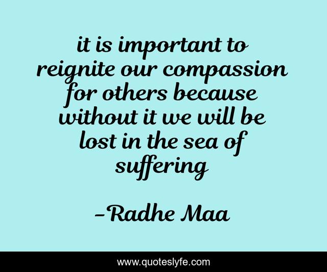 This page presents the quote "it is important to reignite our compassion for others because without it we will be lost in the sea of suffering". Author of this quote is Radhe Maa. This quote is about spiritual, radhe-guru-maa, spiritual-leader, radhe-maa, spiritual-sayings, wisdom, quotes-and-saying, inner-peace, spiritual-insights,.