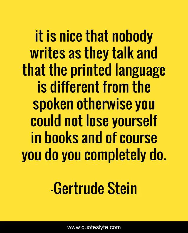 This page presents the quote "it is nice that nobody writes as they talk and that the printed language is different from the spoken otherwise you could not lose yourself in books and of course you do you completely do.". Author of this quote is Gertrude Stein. This quote is about books, reading,.