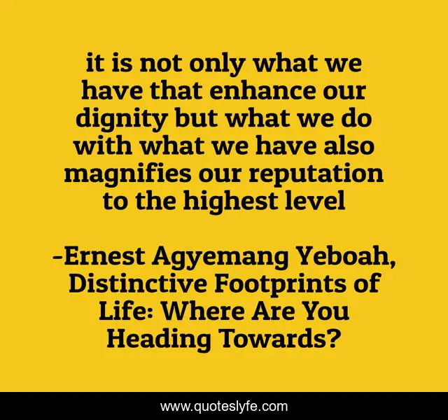 This page presents the quote "it is not only what we have that enhance our dignity but what we do with what we have also magnifies our reputation to the highest level". Author of this quote is Ernest Agyemang Yeboah, Distinctive Footprints of Life: Where Are You Heading Towards?. This quote is about dignity, brainy, actions, reputation, inspirational, mediocrity, enthusiasm,.