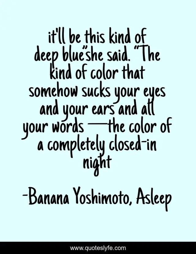 This page presents the quote "it'll be this kind of deep blue”she said. “The kind of color that somehow sucks your eyes and your ears and all your words —the color of a completely closed-in night". Author of this quote is Banana Yoshimoto, Asleep. This quote is about blue, color, night,.