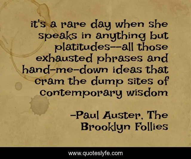 This page presents the quote "it's a rare day when she speaks in anything but platitudes--all those exhausted phrases and hand-me-down ideas that cram the dump sites of contemporary wisdom". Author of this quote is Paul Auster, The Brooklyn Follies. .