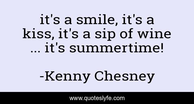 This page presents the quote "it's a smile, it's a kiss, it's a sip of wine ... it's summertime!". Author of this quote is Kenny Chesney. This quote is about smile, summer, kiss, happiness, wine,.