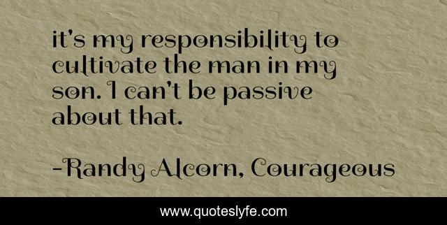 This page presents the quote "it's my responsibility to cultivate the man in my son. I can't be passive about that.". Author of this quote is Randy Alcorn, Courageous. This quote is about parenthood, maturity, fatherhood,.