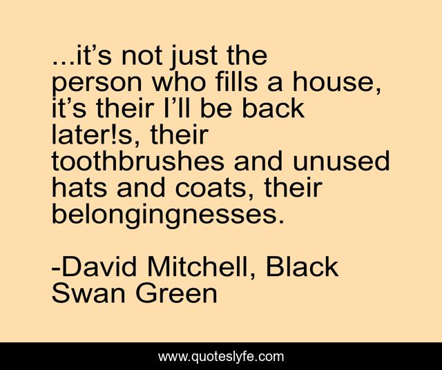 This page presents the quote "...it’s not just the person who fills a house, it’s their I’ll be back later!s, their toothbrushes and unused hats and coats, their belongingnesses.". Author of this quote is David Mitchell, Black Swan Green. This quote is about missing-you, lonely, missing, loneliness, missing-someone, lonely-people,.