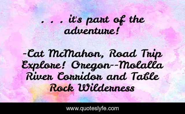 "Cat McMahon, Road Trip Explore! Oregon--Molalla River Corridor and Table Rock Wilderness Quotes." Quoteslyfe.com, 2025. Fri. 05 Dec. 2025. <https://www.quoteslyfe.com/quote/it-s-part-of-the-adventure-137301>.