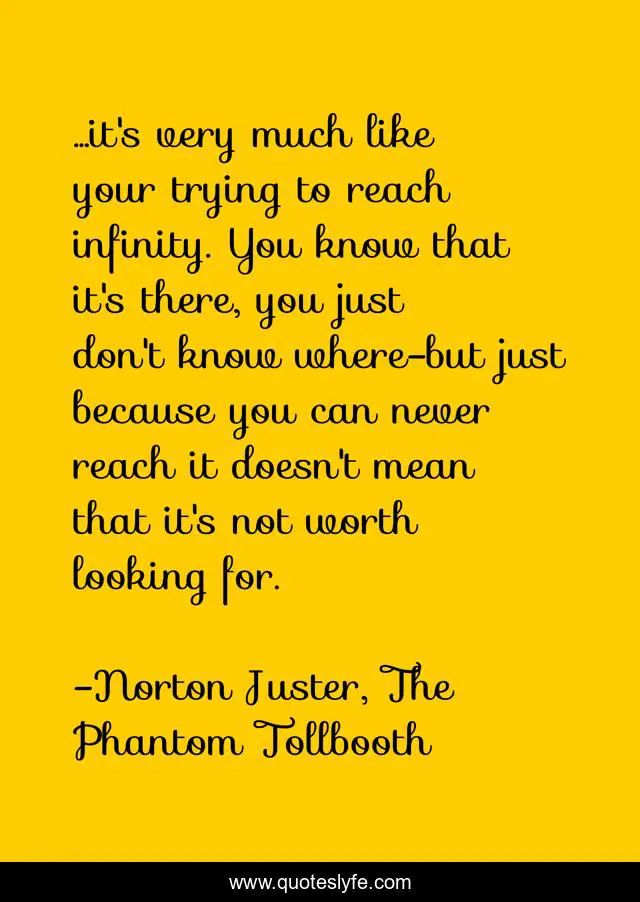 This page presents the quote "...it's very much like your trying to reach infinity. You know that it's there, you just don't know where-but just because you can never reach it doesn't mean that it's not worth looking for.". Author of this quote is Norton Juster, The Phantom Tollbooth. This quote is about infinity, goals,.