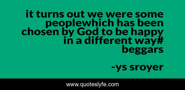 This page presents the quote "it turns out we were some peoplewhich has been chosen by God to be happy in a different way# beggars". Author of this quote is ys sroyer. This quote is about beggars, simple-life, choices,.