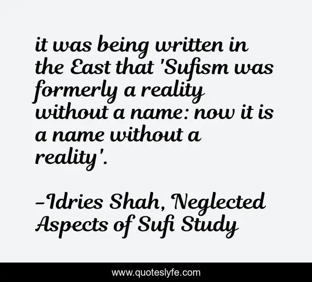 This page presents the quote "it was being written in the East that 'Sufism was formerly a reality without a name: now it is a name without a reality'.". Author of this quote is Idries Shah, Neglected Aspects of Sufi Study. This quote is about crystalization, evolution, religion, sufism, conditioning, sufis, history,.
