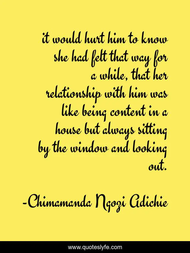 This page presents the quote "it would hurt him to know she had felt that way for a while, that her relationship with him was like being content in a house but always sitting by the window and looking out.". Author of this quote is Chimamanda Ngozi Adichie. .
