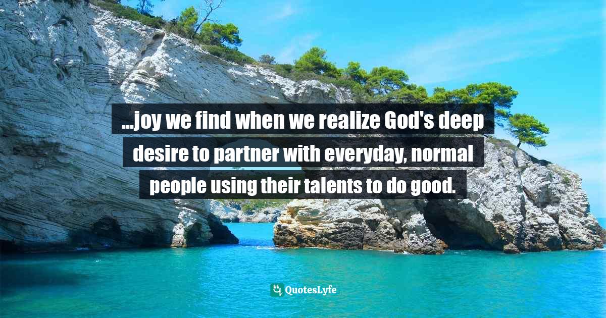 This page presents the quote "...joy we find when we realize God's deep desire to partner with everyday, normal people using their talents to do good.". Author of this quote is Chris Marlow, Doing Good Is Simple: Making a Difference Right Where You Are. This quote is about talents, service, doing-good,.