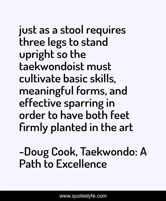 This page presents the quote "just as a stool requires three legs to stand upright so the taekwondoist must cultivate basic skills, meaningful forms, and effective sparring in order to have both feet firmly planted in the art". Author of this quote is Doug Cook, Taekwondo: A Path to Excellence. This quote is about mind-body-spirit, taekwondo, martial-arts, self-defense, sports,.