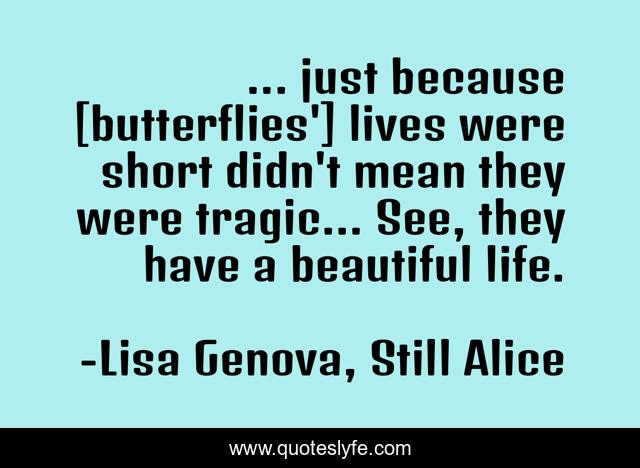 This page presents the quote "... just because [butterflies'] lives were short didn't mean they were tragic... See, they have a beautiful life.". Author of this quote is Lisa Genova, Still Alice. This quote is about enthusiasm, death, inspirational, truth,.