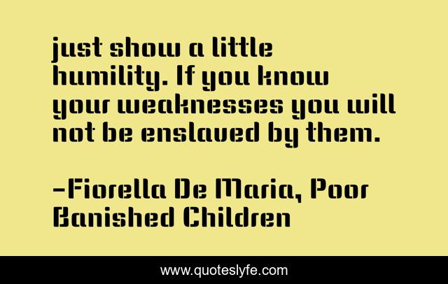 This page presents the quote "just show a little humility. If you know your weaknesses you will not be enslaved by them.". Author of this quote is Fiorella De Maria, Poor Banished Children. This quote is about catholic, faith,.