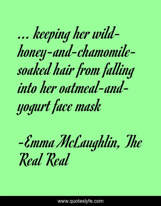 This page presents the quote "... keeping her wild-honey-and-chamomile-soaked hair from falling into her oatmeal-and-yogurt face mask". Author of this quote is Emma McLaughlin, The Real Real. This quote is about herbal, health, beauty,.