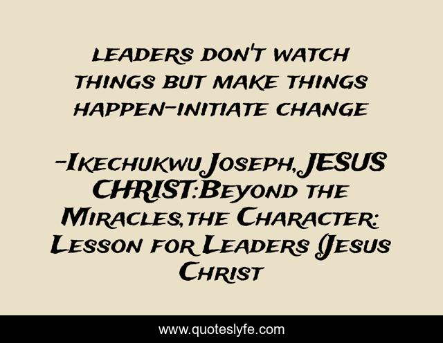 This page presents the quote "leaders don't watch things but make things happen-initiate change". Author of this quote is Ikechukwu Joseph, JESUS CHRIST:Beyond the Miracles,the Character: Lesson for Leaders (Jesus Christ. This quote is about leadership, christian-living,.