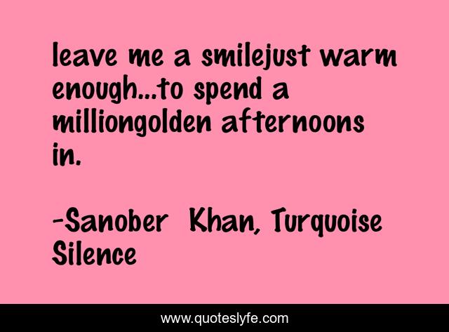 This page presents the quote "leave me a smilejust warm enough...to spend a milliongolden afternoons in.". Author of this quote is Sanober Khan, Turquoise Silence. This quote is about golden, poetry, warm, afternoon, smile, smiling, warmth, happiness,.