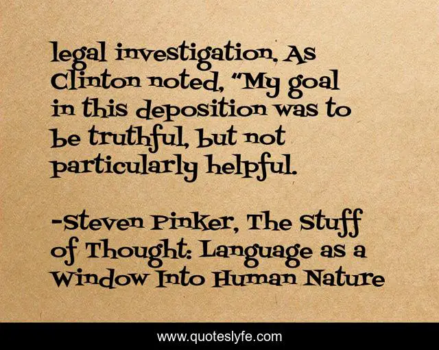 This page presents the quote "legal investigation. As Clinton noted, “My goal in this deposition was to be truthful, but not particularly helpful.". Author of this quote is Steven Pinker, The Stuff of Thought: Language as a Window Into Human Nature. .