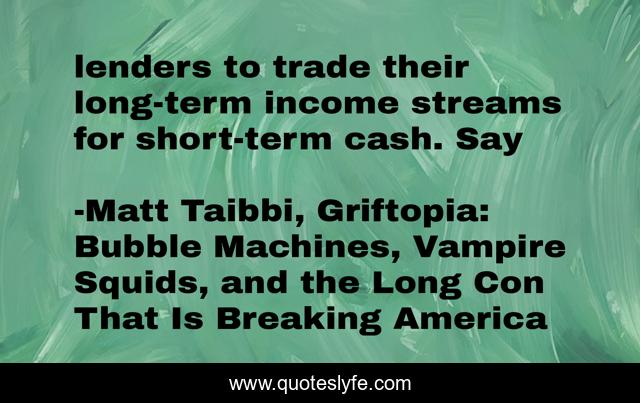 This page presents the quote "lenders to trade their long-term income streams for short-term cash. Say". Author of this quote is Matt Taibbi, Griftopia: Bubble Machines, Vampire Squids, and the Long Con That Is Breaking America. .