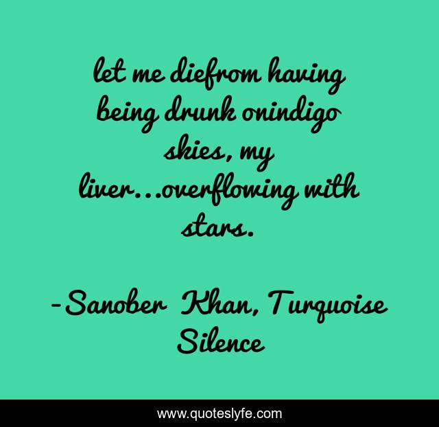 This page presents the quote "let me diefrom having being drunk onindigo skies, my liver...overflowing with stars.". Author of this quote is Sanober Khan, Turquoise Silence. This quote is about poets, indigo, exaggeration, drunk, night-sky, poetry, skies, stars, night,.