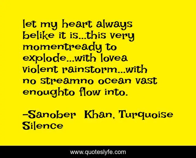 This page presents the quote "let my heart always belike it is...this very momentready to explode...with lovea violent rainstorm...with no streamno ocean vast enoughto flow into.". Author of this quote is Sanober Khan, Turquoise Silence. This quote is about deep-thoughts, love, stream, deep-feelings, personal, flow, storms, poetry, deep,.