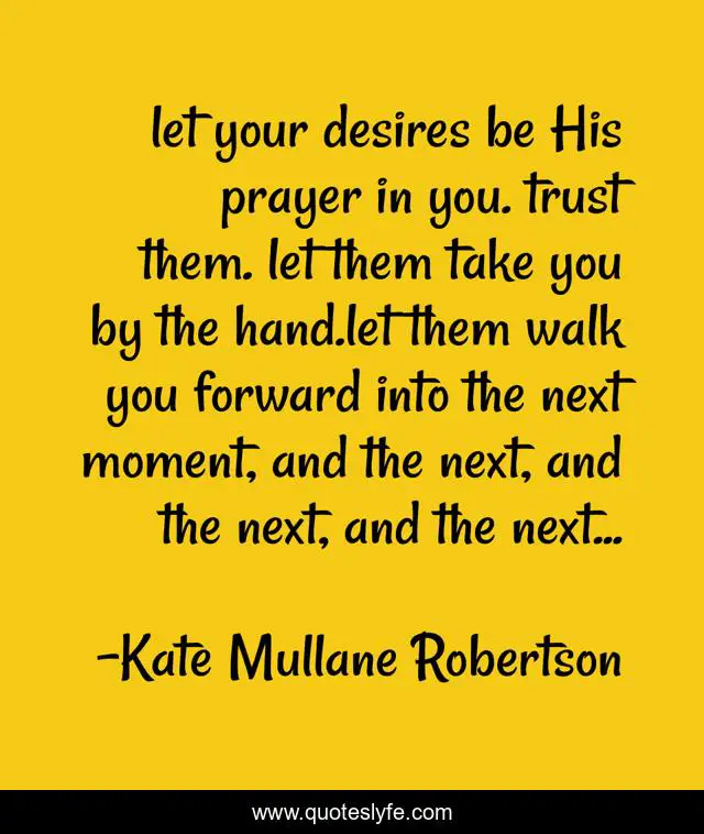 This page presents the quote "let your desires be His prayer in you. trust them. let them take you by the hand.let them walk you forward into the next moment, and the next, and the next, and the next...". Author of this quote is Kate Mullane Robertson. This quote is about desire, forward, step, prayer, walk,.