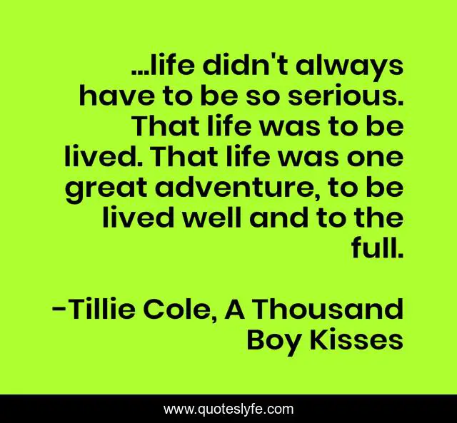 This page presents the quote "...life didn't always have to be so serious. That life was to be lived. That life was one great adventure, to be lived well and to the full.". Author of this quote is Tillie Cole, A Thousand Boy Kisses. .