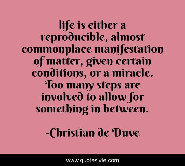 This page presents the quote "life is either a reproducible, almost commonplace manifestation of matter, given certain conditions, or a miracle. Too many steps are involved to allow for something in between.". Author of this quote is Christian de Duve. This quote is about miracles, science, life,.