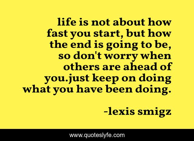 This page presents the quote "life is not about how fast you start, but how the end is going to be, so don't worry when others are ahead of you.just keep on doing what you have been doing.". Author of this quote is lexis smigz. This quote is about enthusiasm, inspirational,.
