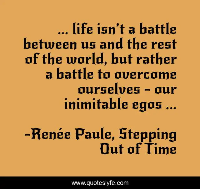 This page presents the quote "... life isn’t a battle between us and the rest of the world, but rather a battle to overcome ourselves - our inimitable egos ...". Author of this quote is Renée Paule, Stepping Out of Time. This quote is about battle, ego,.