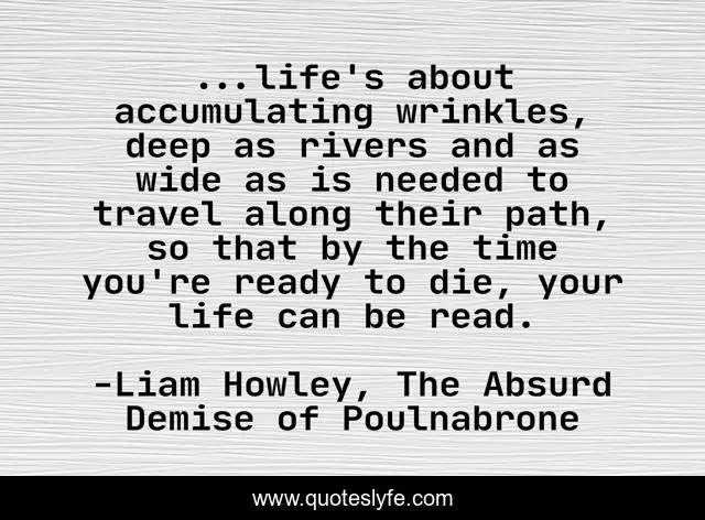 This page presents the quote "...life's about accumulating wrinkles, deep as rivers and as wide as is needed to travel along their path, so that by the time you're ready to die, your life can be read.". Author of this quote is Liam Howley, The Absurd Demise of Poulnabrone. This quote is about humorous, wisdom,.
