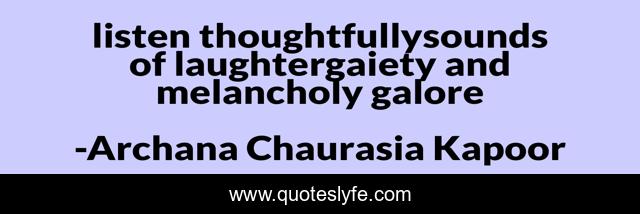 This page presents the quote "listen thoughtfullysounds of laughtergaiety and melancholy galore". Author of this quote is Archana Chaurasia Kapoor. This quote is about melancholy, joy, grief, sadness, laughter, happiness, thoughtfulness,.