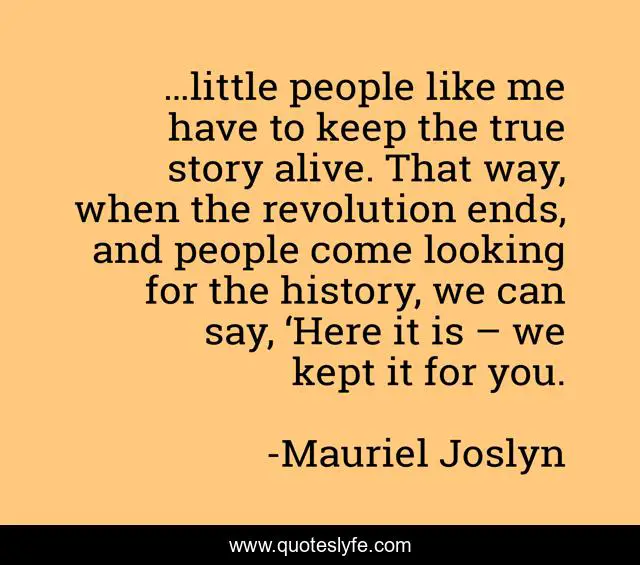This page presents the quote "…little people like me have to keep the true story alive. That way, when the revolution ends, and people come looking for the history, we can say, ‘Here it is – we kept it for you.". Author of this quote is Mauriel Joslyn. .