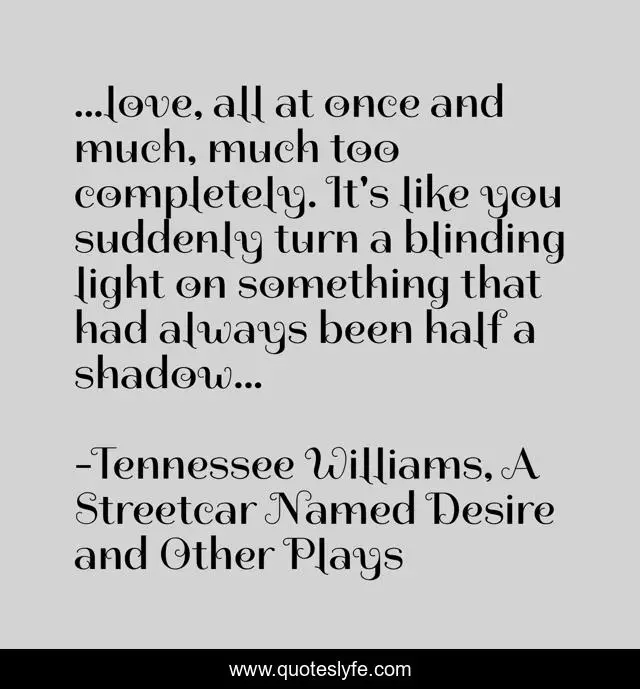 This page presents the quote "...love, all at once and much, much too completely. It's like you suddenly turn a blinding light on something that had always been half a shadow...". Author of this quote is Tennessee Williams, A Streetcar Named Desire and Other Plays. This quote is about play, love, first-time, first-love, youth, tennessee-williams, affection,.