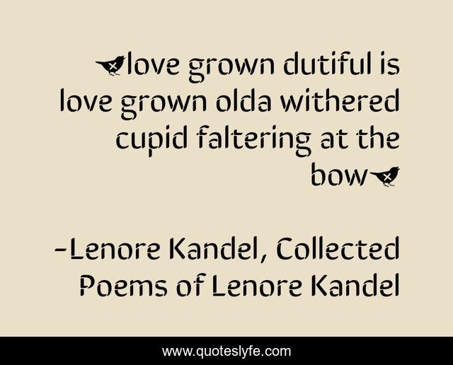 This page presents the quote "…love grown dutiful is love grown olda withered cupid faltering at the bow…". Author of this quote is Lenore Kandel, Collected Poems of Lenore Kandel. This quote is about duty, withered, old, cupid, free, necessity, love, affection,.