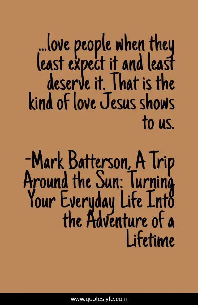 This page presents the quote "...love people when they least expect it and least deserve it. That is the kind of love Jesus shows to us.". Author of this quote is Mark Batterson, A Trip Around the Sun: Turning Your Everyday Life Into the Adventure of a Lifetime. This quote is about loving-others, jesus,.