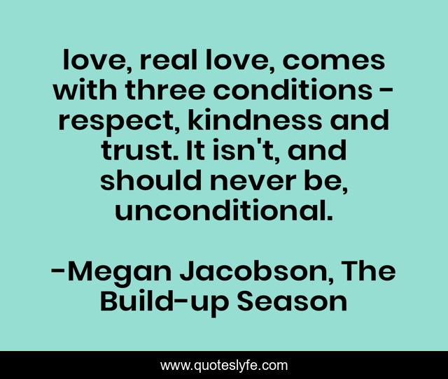 This page presents the quote "love, real love, comes with three conditions - respect, kindness and trust. It isn't, and should never be, unconditional.". Author of this quote is Megan Jacobson, The Build-up Season. This quote is about australian-literature, love, megan-jacobson, aussie-author, unconditional-love, affection,.