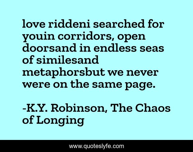 This page presents the quote "love riddeni searched for youin corridors, open doorsand in endless seas of similesand metaphorsbut we never were on the same page.". Author of this quote is K.Y. Robinson, The Chaos of Longing. This quote is about poem, love, poetry, affection,.