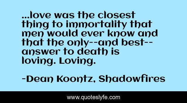 This page presents the quote "...love was the closest thing to immortality that men would ever know and that the only--and best--answer to death is loving. Loving.". Author of this quote is Dean Koontz, Shadowfires. This quote is about immortality, love, affection,.