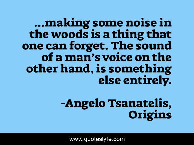 This page presents the quote "...making some noise in the woods is a thing that one can forget. The sound of a man’s voice on the other hand, is something else entirely.". Author of this quote is Angelo Tsanatelis, Origins. This quote is about epic-fantasy, wise-words,.