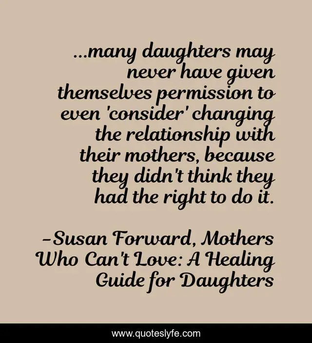 This page presents the quote "...many daughters may never have given themselves permission to even 'consider' changing the relationship with their mothers, because they didn't think they had the right to do it.". Author of this quote is Susan Forward, Mothers Who Can't Love: A Healing Guide for Daughters. This quote is about relationships, psychology, family, self-help,.
