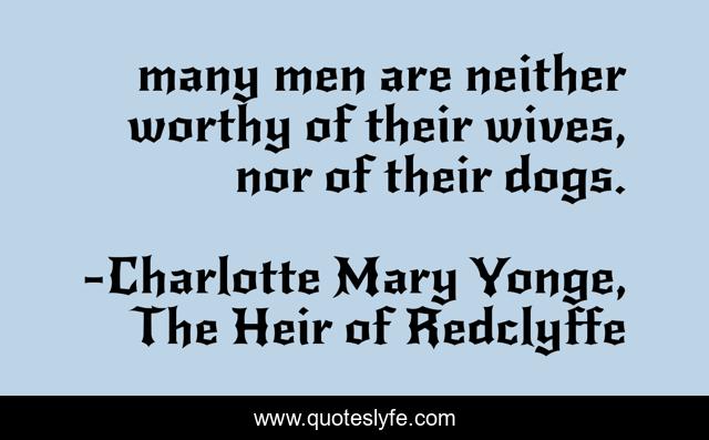 This page presents the quote "many men are neither worthy of their wives, nor of their dogs.". Author of this quote is Charlotte Mary Yonge, The Heir of Redclyffe. This quote is about humor, true,.