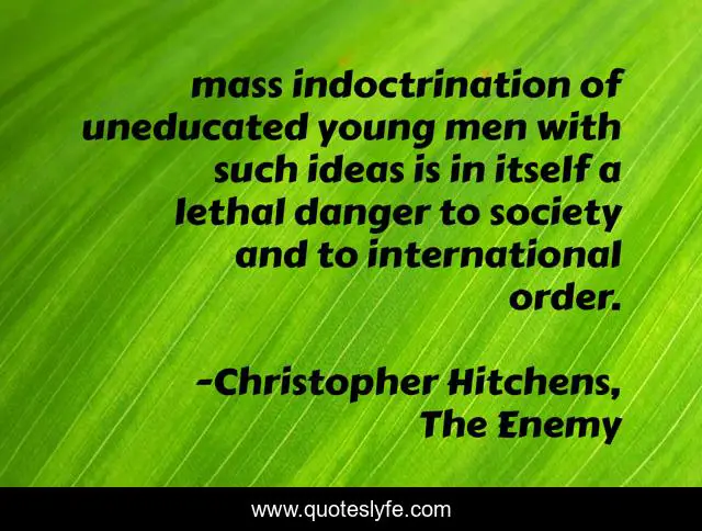 This page presents the quote "mass indoctrination of uneducated young men with such ideas is in itself a lethal danger to society and to international order.". Author of this quote is Christopher Hitchens, The Enemy. .