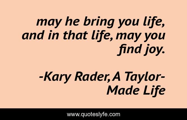 This page presents the quote "may he bring you life, and in that life, may you find joy.". Author of this quote is Kary Rader, A Taylor-Made Life. This quote is about joy, life,.