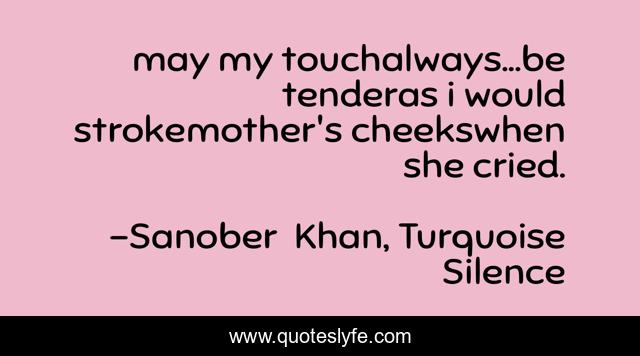 This page presents the quote "may my touchalways...be tenderas i would strokemother's cheekswhen she cried.". Author of this quote is Sanober Khan, Turquoise Silence. This quote is about love, family, gentle, poetry, tenderness, tears, crying, mother, touch,.